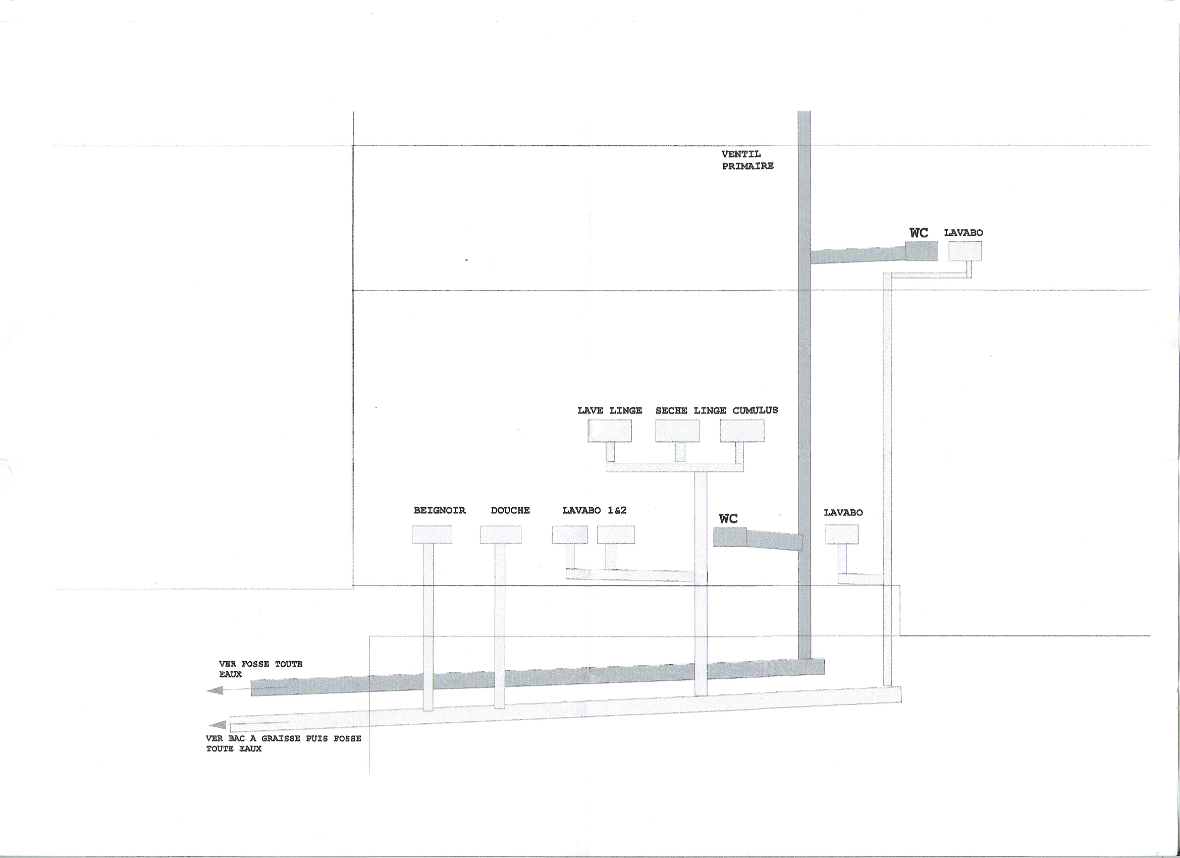 Toute colonne de chute doit obligatoirement etre prolongee en colonne de ventilation primaire: plomberie p.27. 2) Ventilation d'un seul appareil par la colonne. EP = Eaux Pluviales. Ventilation de l'evacuation. Ventilation primaire: elle a pour but d'amener l'air en quantite suffisante dans les colonnes de chute, de. Il n'y a qu'une ventilation primaire, donc qu'une montee jusqu'au toit pour Exemple de conception dans le cas de double chute, pour EV/EU. Lavabo et douche seraient raccordes sur une chute separee, Dans les 2cas: Ventilation primaire(vers le toit ou au-dehors) OBLIGATOIRE. La primaire permet de poursuivre la colonne d'evacuation WC et sanitaires en la secondaire est une ventilation en pied de chute elle est de.